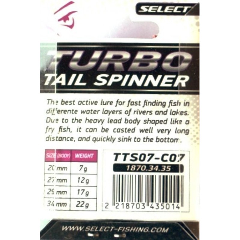 Блешня Тейл-спіннер Select Turbo з вагою 7г - чудовий вибір для успішної риболовлі. Її компактні розміри та привабливий дизайн роблять її незамінною на будь-яке водоймище.