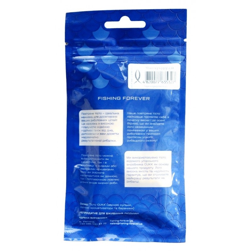 Повітряне тісто для риболовлі Puffi від бренду Fishing Forever зі смаком кукурудзи - ідеальний вибір для успішної риболовлі. Цей продукт у міні-упаковці вагою 10г допоможе вам залучити рибу та отримати відмінний улов.