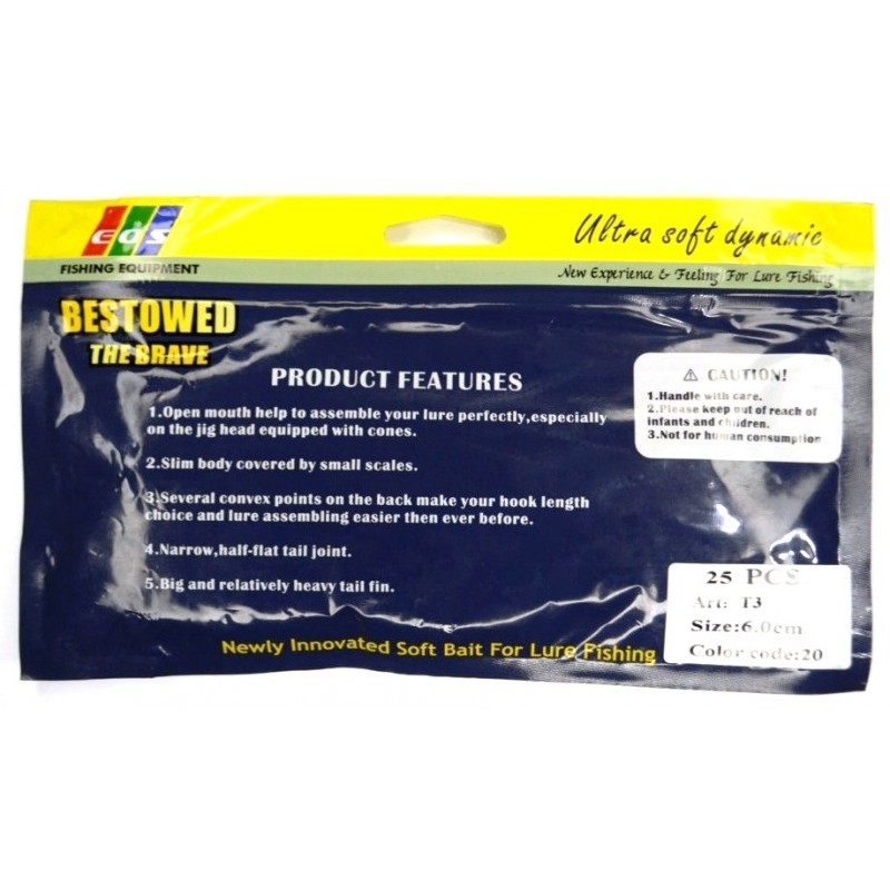 Представляємо вам високоякісну силіконову приманку EOS T3, призначену спеціально для риболовлі. Ця приманка має довжину 60 мм і поставляється в упаковці по 25 штук, що забезпечує достатню кількість для успішної риболовлі.