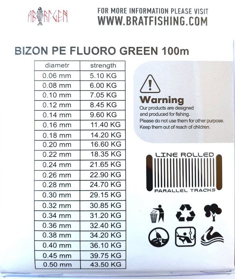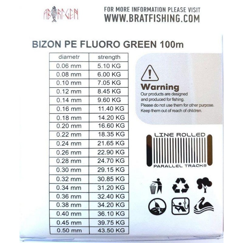 це дає можливість здійснювати точні кидки снасті на великі відстані, не піддаючи підвищеного зносу котушки і кільця. Щільне плетіння ниток і спеціальне просочення надає рибальським шнурах BIZON PE FLUORO GREEN практично ідеальне круглий перетин.